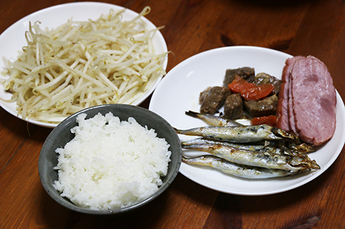 デブの2週間ダイエット日記40日目、本日の朝食はししゃもとハムと肉ともやしの朝食にごはんで朝食をいただき、朝食は終了!!最近、魚系の食事、特にししゃもにはまっているデブダイエッター。ししゃもハマっているのは良いのですが、食べ始めたら何匹でもいける気がしてムシャムシャ食べ過ぎてしまいそうになる。